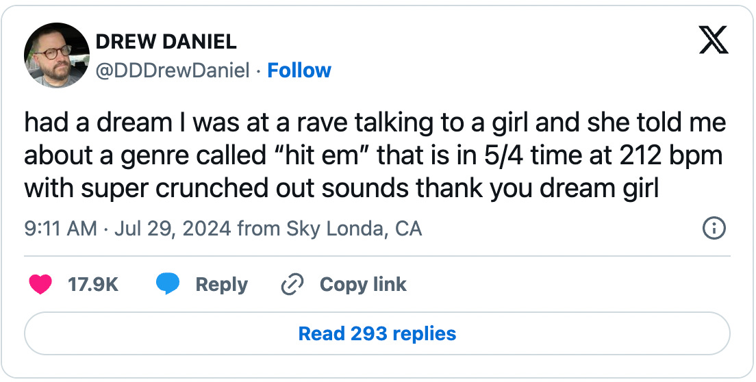 He woke up evidently amused by the aesthetic promise of “Hit Em” and told the world about it in a tweet. His following—a group of highly online, eccentric electronic music nerds—immediately got to work literalizing his dream genre. Within a day, experiments in “Hit Em” took over music twitter and proliferated across the internet. These tracks were glitchy, industrial-sounding, and very fast, placing it in the sonic realm of (according to one Reddit user) “Gabber” and “Speedcore.”